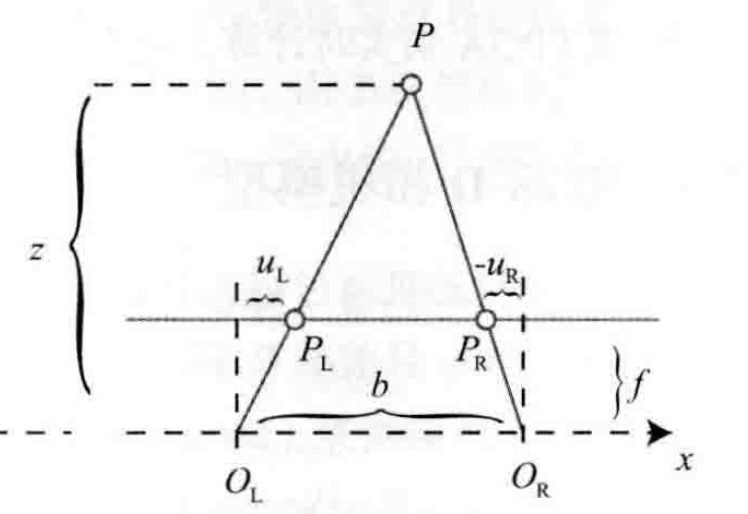 在相机完成校正后,则有 d / b = f / z,其中