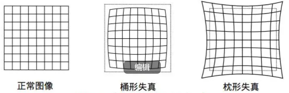 - 径向畸变(枕形、桶形): 光线在远离透镜中心的地方比靠近透镜中心的地方更加弯曲。