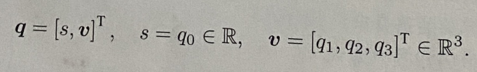 也可以用一个标量和一个向量来表达四元数: