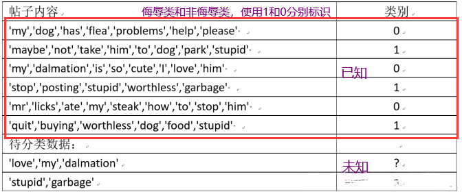classVec = [0,1,0,1,0,1] # 类别标签向量,1代表侮辱性词汇,0代表不是