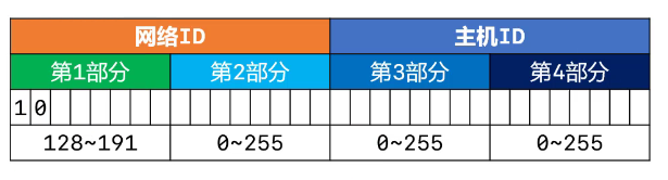 - 可以分配给主机的:第1部分的取值范围是128~191