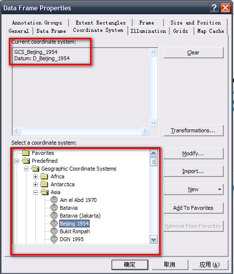 3.2.1 添加空间参考信息:在“view/data frame properties”的“coordinate properties”中选择坐标系。如果是大地(投影)坐标系选择“predefined”中的“Projected coordinate system”,坐标单位一般为米。如果是地理坐标系(坐标用经纬度表示)表示则选择“Geographic coordinate system”。在这里,我们选择“Geographic coordinate system”下的“Beijing1954”坐标系,确定即可。
