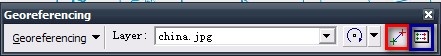 3.1 地图配准工具条的加载:在工具栏空白处右键单击,找到“Georeferencing”菜单,点击,即可成功加载配准工具条。红色框内为添加控制点按钮,蓝色框内为控制点属性信息按钮;