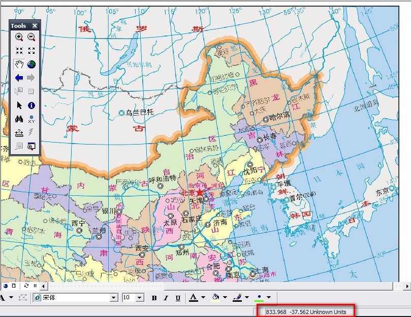 2 加载数据:打开arcgis软件,加载数据,会出现提示框“Unknown Spatial Reference”,即缺少空间参考。忽略,直接OK即可把地图加载到窗口中。但是细心的操作者会发现,鼠标移动到地图上相应的坐标点时,状态栏显示的坐标却与地图上的不一致。注意下图红色框内的信息!