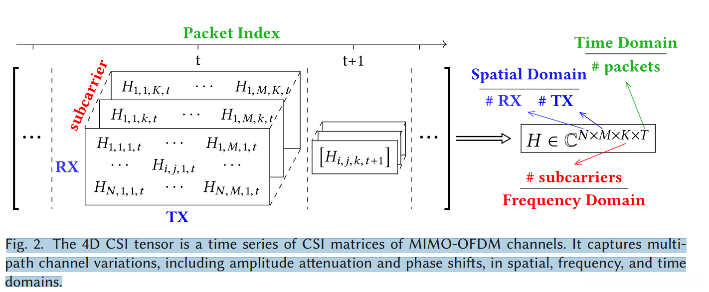 4D CSI 张量是 MIMO-OFDM 信道的 CSI 矩阵的时间序列。它捕获空间、频率和时域中的多径信道变化,包括幅度衰减和相移。在提取CSI时也要消除各种误差的影响,例如循环移位分集 (CSD) 的时间延迟,采样时间偏移(STO),采样频率偏移(SFO),波束形成矩阵的幅度衰减和相移。CSI矩阵的时间序列表征不同域的MIMO信道变化。