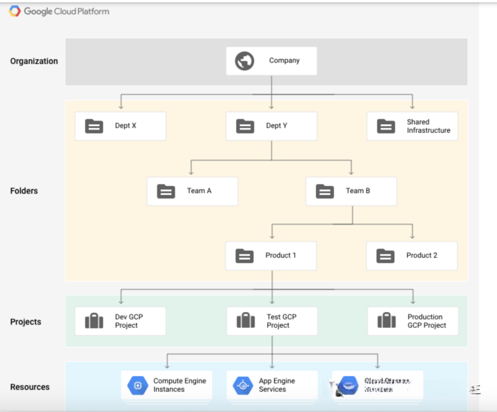 Google Cloud 的资源层次架构与传统操作系统中的文件系统具有相似性,采用分层架构进行组织与管理。每个资源仅有一个父级资源。通过这种架构设计,可以对父级资源设定访问权限控制政策与配置参数,并对子级资源实施继承机制,确保子级资源能够继承父级资源的访问权限与 Identity and Access Management (IAM) 设置。需要注意的是,子节点策略不得限制父层节点已授予的访问权限。