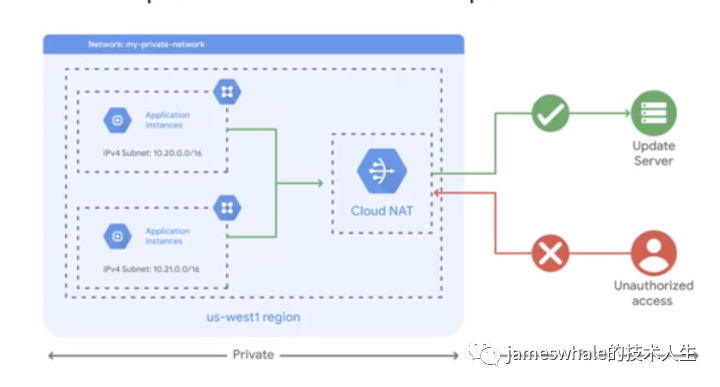 为防止业务计算实例遭受外界攻击,GCP包含一系列安全措施,如检测恶意流量攻击DDoS、部署防火墙、配置API Gateway、采用NAT等防护策略。基于NAT机制,内网设备可访问外网资源,而外网设备无法访问内网设备。