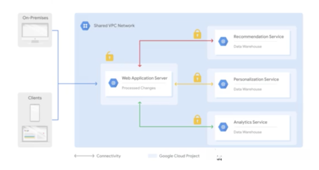 Shared VPC,所有服务和网络元素集中在一个VPC内,实现集中管理,不能在组织间跨越。