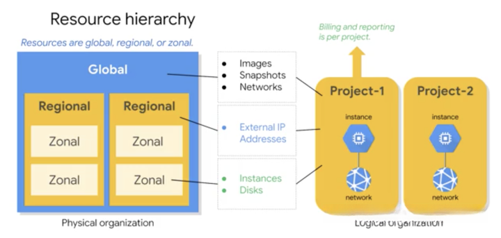 Resource:涵盖计算、网络、存储、App Engine、GKE等类型,每个资源仅限于一个Project。根据作用范围,分为Global、Regional、Zonal三种类型,如图所示: