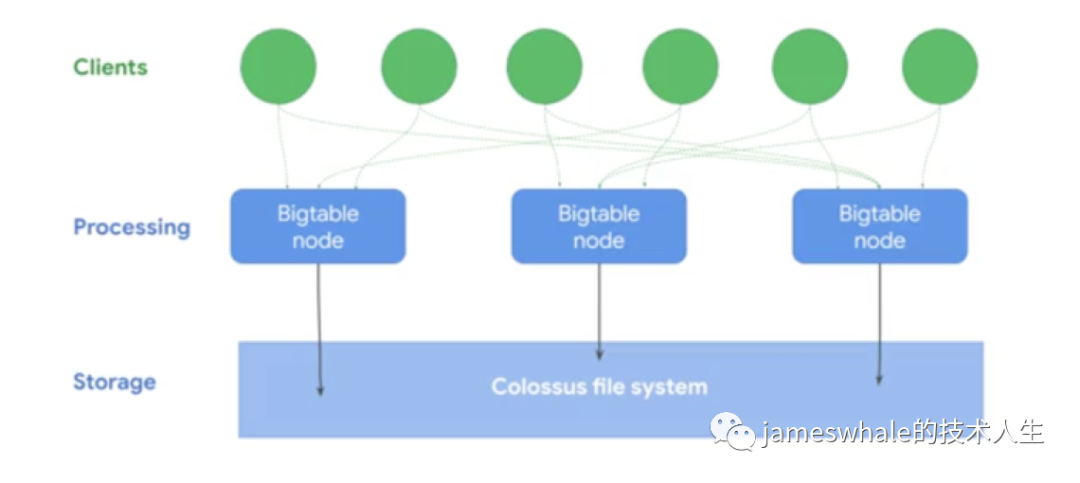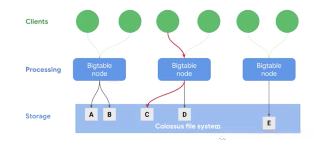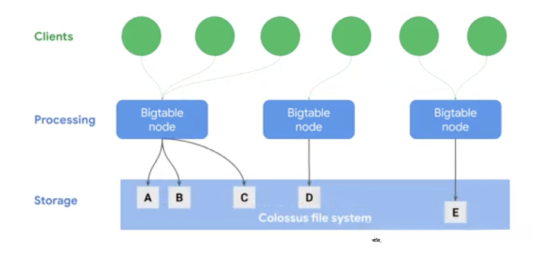 处理与存储是分开进行的,可以通过增加Bigtable node节点,方便地提高处理能力。同时,node节点故障不会导致数据丢失。