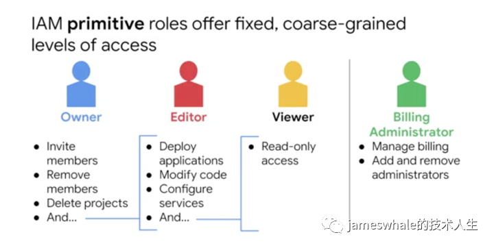 基础:IAM基础角色为所有GCP服务提供了基于角色的访问控制机制,采用细粒度的权限划分。具体包括Owner、Editor、Viewer和Billing Administrator四个角色。其中,Owner角色拥有Editor角色的所有权限,Editor角色拥有Viewer角色的所有权限,而Billing Administrator角色则具备管理账单和增删管理者的权限。具体架构如下图所示。