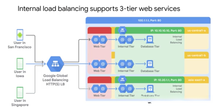 HTTP(s) load balancing, 全局负载均衡,自动扩缩容,URL映射,架构如下: