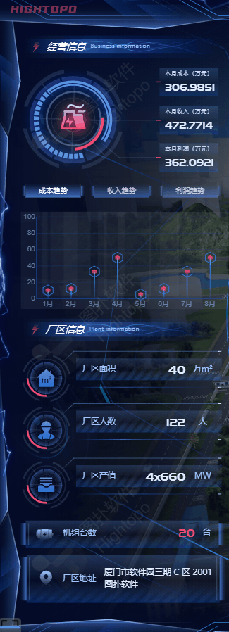 大屏左侧的厂区信息面板上清晰地呈现了本项目的各项核心数据,并特别标注了包含的两大类核心内容:一是厂区基本信息要素分布情况展示图;二是经营运营指标实时监控图表集锦。在右侧操作界面中,则专门设置了一个独立的子区域用于实时追踪成本费用构成比例变化曲线图以及收益增长趋势可视化分析表单。