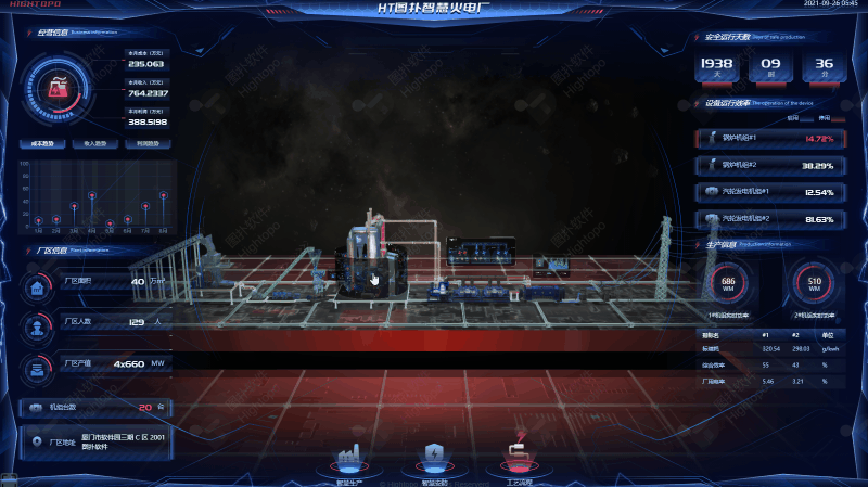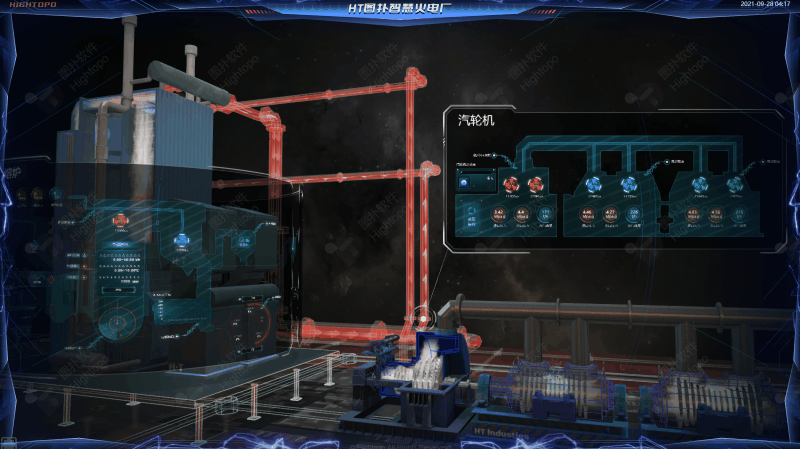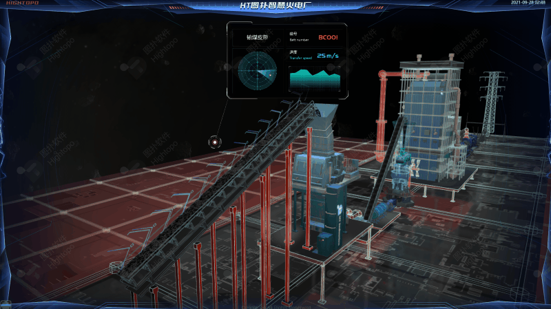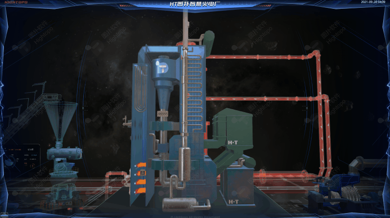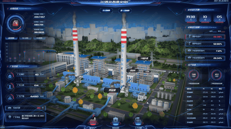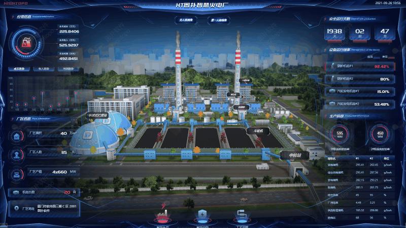 以某一沿海燃煤发电厂为原型的案例配备4×660MW超临界燃煤发电机组,在线应用数据传输技术将厂区运行信息与现场重点设备的运行状态实时同步至场景中。该系统设计实现了厂区运维人员在HT可视化大屏上实时掌握生产数据的动态更新。