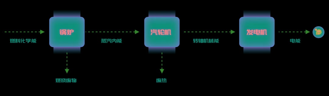 经过完成化学能到热能再到机械能最后转换成电能这一系列的能量转换过程从而持续不断地向电网输送电力