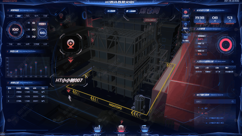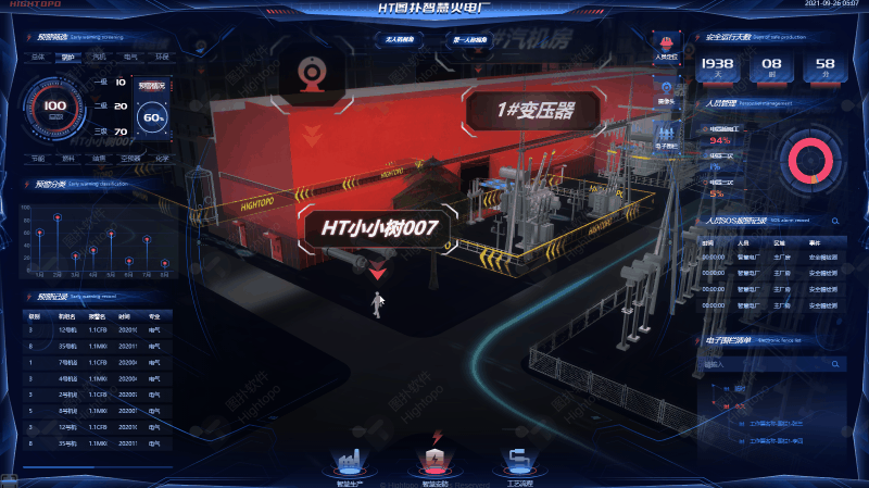 HT可视化实现了无人机动态遍历视角与第一人称观察角度的交互式动态展示,并通过视觉反馈呈现智慧火电厂全场景的核心运行逻辑。