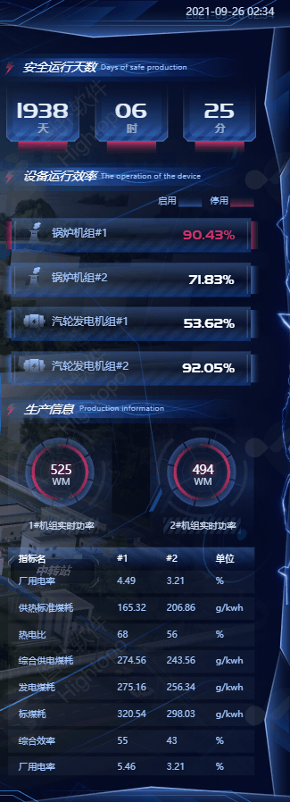 右侧部分记录了安全生产持续天数,并显示从投产到当前的安全运行累积时长;设备运转效能配合生产数据实时追踪锅炉及汽轮发电机组的各项运转参数和性能指标。