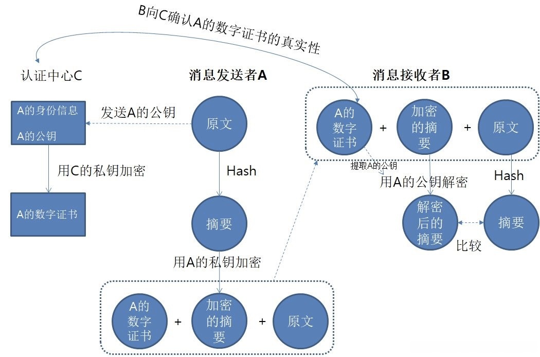 另外一个问题:消息接收者B如何向认证中心确认发送者的公钥是真实