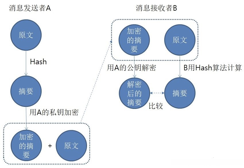 接收方B在接收到消息后通过使用A的公钥解密了数据摘要(其中A的公钥可被公开获取)。