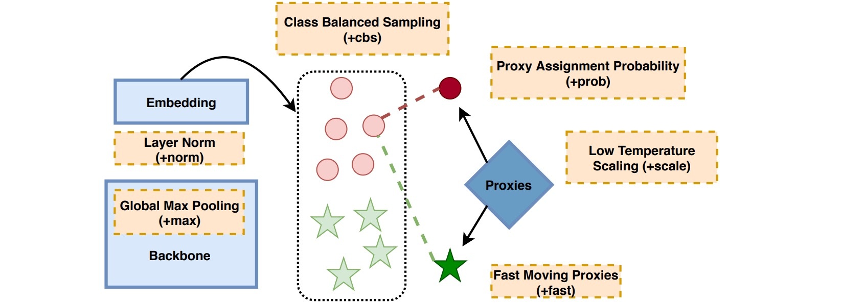通过Proxy-based方法的度量损失指标为每个类别引入一个代理样本,并降低了同一类别内的样本与相应代lab之间的距离;同时提高了不同类别间的样本与各自代表性的代lab之间的距离。其中部分代lab可通过给定的数据集生成预设值域中的向量表示或优化得到可学习向量参数化形式。