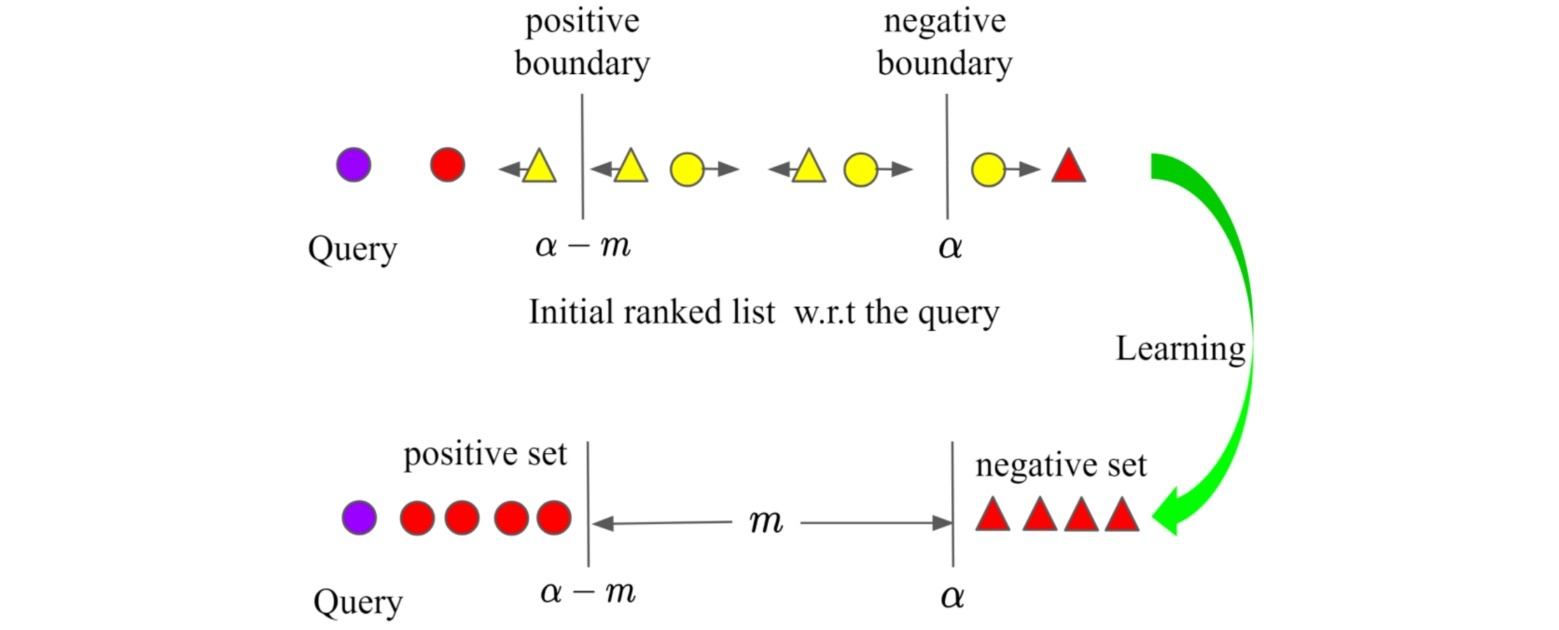 基于给定的锚点样本x_i^c之后应用Ranked List Loss模型通过相似性评估确定其他样本的排序顺序。随后系统会筛选出与锚点的距离超过阈值α减去m的所有正类样例以及与锚点的距离低于α的所有负类样例。并期望所有负类样例之间的相互距离均高于α值;同时所有正类样例之间的相互距离均低于(α−m)。