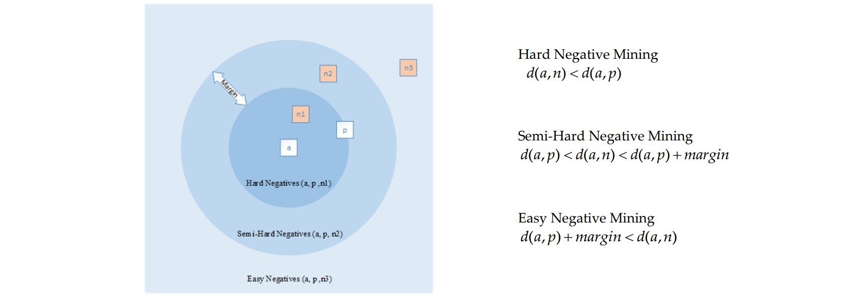 在深度度量学习中,在不同标签下的样本对数量通常显著高于相同标签下的正样本对数量。若采用简单的随机采样策略,则可能导致网络学习效果受限的原因是存在大量低质量的负面配对难以为网络提供有价值的信息;因此建议采用**负样本挖掘(negtive mining)**策略来筛选高质量的负面配对
