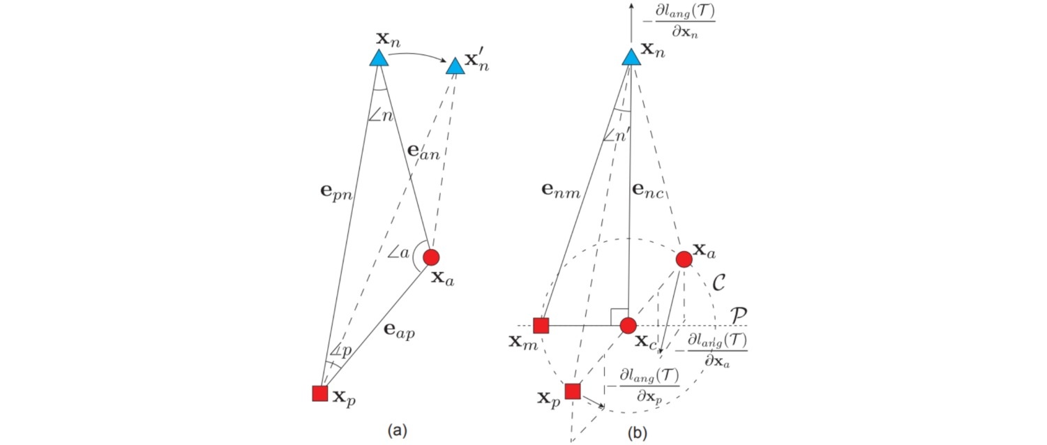 基于角度损失(angular loss)的方法, 通过引入包含三元组(x_a,x_p,x_n)的三阶几何约束条件, 实现了对目标物体尺度变化及旋转变化下的鲁棒识别能力。该方法通过构建以锚点样本x_a及其正样本x_p中心位置为基准点, 即中心点坐标计算公式为\mathbf{x}_c = (\mathbf{x}_a + \mathbf{x}_p)/2, 并以此为中心绘制圆形区域; 接着将负样本\mathbf{x}_n与该基准点\mathbf{x}_c连接起来并绘制垂线至圆形区域相交于另一端点\mathbf{x}_m. 当检测到目标物体的角度参数n'减少时, 负样本\mathbf{x}_n将被强制使其沿着\mathbf{x}_c\mathbf{x}_n方向移动远离原来的锚定位置, 同时使得锚定位置间的距离逐渐缩小。