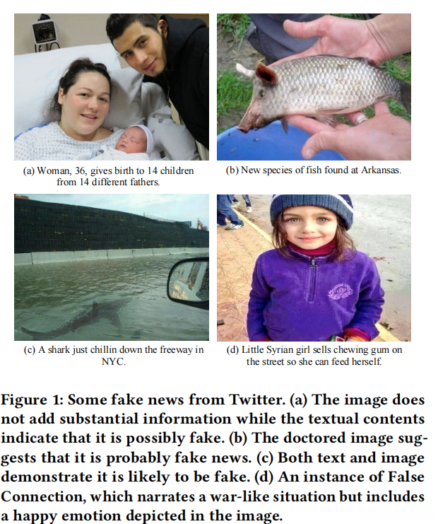现有的关于自动假新闻检测的研究主要集中在文本内容上,无论是使用传统的学习方法,如决策树分类器,还是使用深度学习方法,如卷积神经网络(CNN)。然而,社交媒体上的帖子通常包含丰富的多模态信息,基于单峰(单模态)特征的检测远远不够。图1显示了来自推特的一些例子,说明了为什么这四条新闻被认定是虚假的原因。最近的研究试图融合文本和视觉特征,产生多模态后表示,然后提高假新闻检测的性能。然而,我们认为应该适当地应用更先进的多模态表示学习,因为获得更复杂的对齐单模态表示和跨模态特征是有效的多模态假新闻检测的先决条件。此外,跨模态特征在某些情况下不一定发挥关键作用。例如,图1(a)中的文本内容非常荒谬,足以表明它是假的。与之相反,图1(d)中的跨模态信息间隙可以帮助提高分类精度。因此,来自不同模式的特征如何影响决策过程,以及我们如何使其更有效和更可解释,仍然是一个悬而未决的问题。