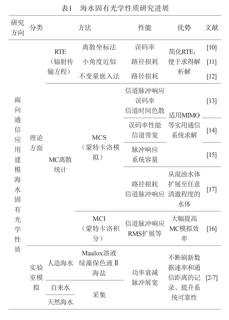 通过对相关报道的深入分析,并参考如表1所示的数据支持材料, 可获得信息有助于了解基于海水固有光学性质的研究成果取得的显著进展. 其中, 在通信信道特性研究方面取得了显著进展, 并已完成理论建模工作; 同时, 在实验室模拟工作中已进入应用阶段.