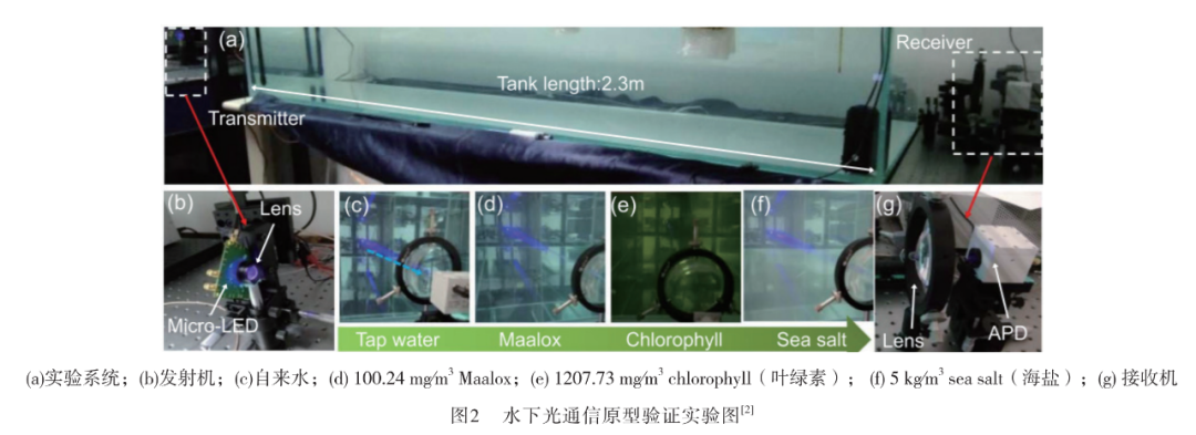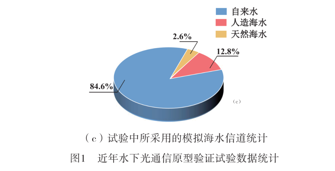 该技术的显著优势已引起国际知名研究机构的关注,在过去几年里开展了大量原型验证试验(编号为2-7),取得了显著进展并不断刷新数据传输速率及通信距离上限。目前已有多个实例展示了该项技术的实际应用潜力[如图1(a)和(b)所示]。值得注意的是,在模拟实验中采用的海水信道类型各有不同:包括自来水、人造海水以及天然海水环境(如图1(c)所示)。然而,在实际应用中发现这一复杂现象——海洋湍流——对水下光通信系统性能的影响机制尚不明确。因此,在信道建模过程中如何准确刻画这一影响因素仍面临重要挑战。