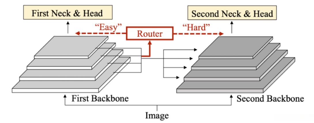 目标检测器通常由主干网络Backbone、脖颈网络Neck、检测器头Head三部分组成,主干网络 (如ResNet50、Vision Transformer等等) 用于提取基础视觉特征,脖颈网络 (如FPN、BiFPN等等) 用于融合多尺度特征信息,检测器头则通过特定设计来预测目标的种类和位置。如上图,本文所提的目标检测器的通用动态架构也是基于此架构,但区别之处在于其拥有两个级联主干网络及对应的脖颈网络和检测器头,并且在两个主干网络之间插入了动态路由器 (Router) 。