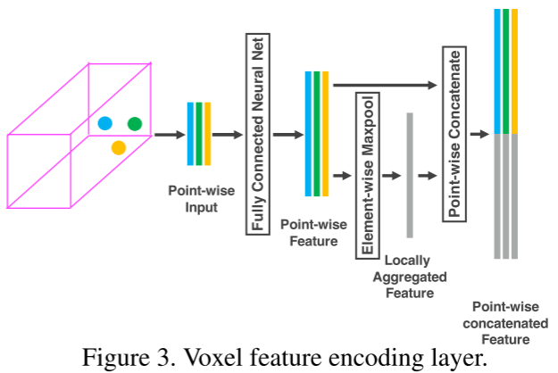 3.element-wise maxpool:经过FCN只是对每个point的操作,point之间的信息没有发生交互,所以对同一个voxel内所有fi做最大池化,选出一个locally aggregated feature f~;