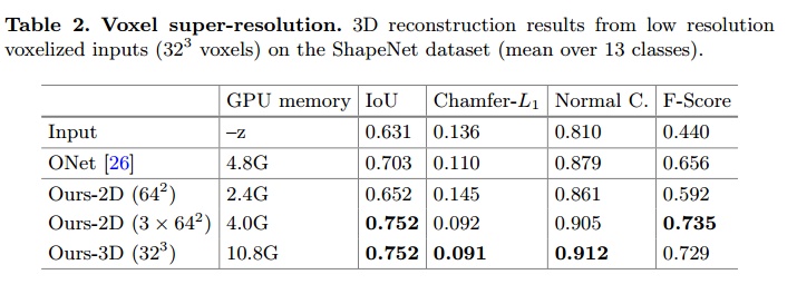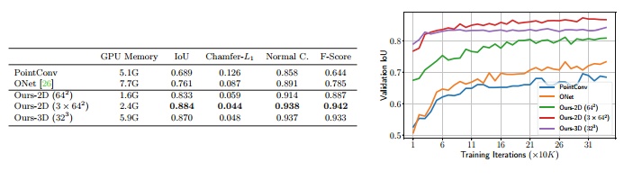 首先在ShapeNet上对于单对象重建任务进行了评估。考虑两种不同类型的3D输入:噪声点云和低分辨率体素。文中的方法在所有指标上都取得了很好的结果。只经过几次迭代就达到了很高的验证IoU。此外,还进行了超分辨率重建任务结果的评估,即从体素化的模型中恢复其高分辨率。该任务在单平面恢复的情况下失败了,但三平面和体积重建是成功的,且三平面重建所需GPU资源更少。(下图顺序为:一般重建定性结果->一般重建定量分析->超分辨率重建定性结果->超分辨率重建定量分析)