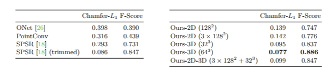 对比对象: ONet(使用全连接网络,输入全局编码重建),PointConv(有使用局部特征信息,但是没有使用卷积),SPSR(泊松曲面重建,根据点云进行模型三维重建的技术,但是要求额外的曲面法线,这在现实中很难获得)。