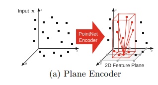 基于平面的特征投影聚合(平面编码) :对于每个输入点,在规范平面上执行正投影。对于体素输入,将体素中心视为一个点,并将其投影到平面上。以H×W像素单元的分辨率对规范平面(即与坐标系的轴对齐的平面)上的投影结果进行离散化。使用平均池来聚合投影到同一像素上的特征,从而产生维度为H×W×d的平面特征,其中d是特征维度。