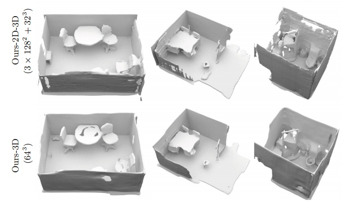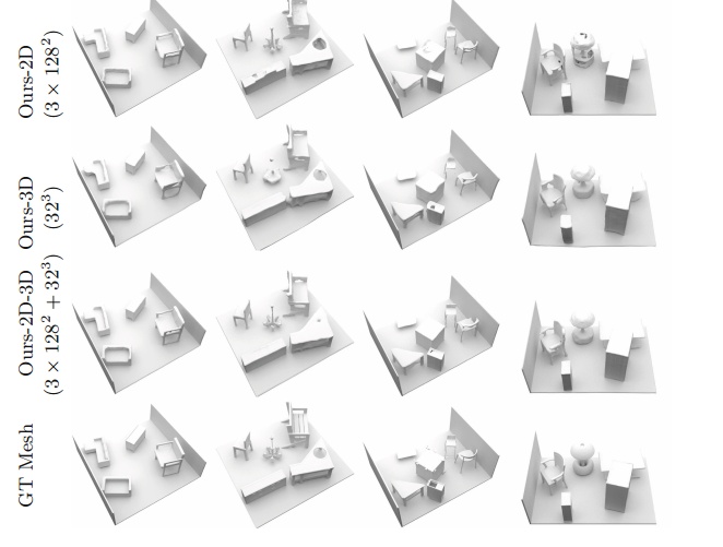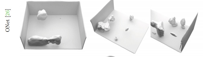 (值得注意的是ONet虽然不能产生室内对象的合理结果,但是其生成的模型在墙壁结构方面更加规整?需要看下原论文搞明白为什么)