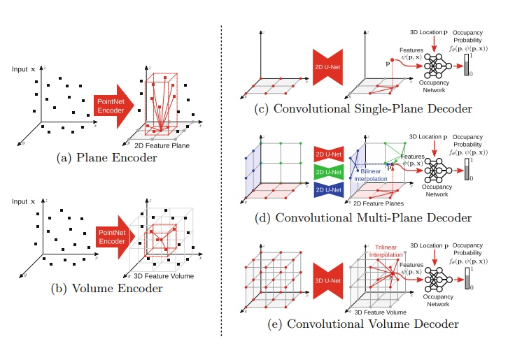 总结: 将卷积引入了隐式场神经网络模型。总体的神经网络框架是:PointNet或3DCNN提取特征->对特征通过聚合的方式进行2D像素化或3D体素化->对聚合结果,也就是特征图用U-Net进行处理以强化特征->用带有ResNet的全连接网络来预测对应的隐式场模型中某一位置的值,该位置的特征值通过对特征图或特征模型中附近位置的特征值的查询和插值获得。可用于大型场景建模,但处理点的能力有限,需要先抽稀后再处理。