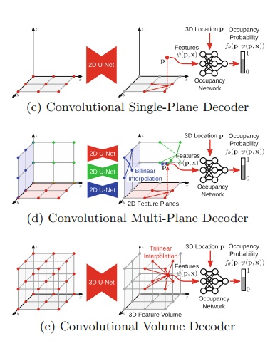 某一位置的特征值查询方式: 目标位给定特征图,通过神经网络求得3D空间中任意一位置p的占用概率。而位置p的特征值获取则通过插值获取。对于单平面解码器,将每个点p正交投影到地平面上,并通过双线性插值查询特征值。对于多平面解码器,通过对所有3个平面的特征求和来聚合来自3个规范平面的信息。对于体积解码器则使用三线性插值。