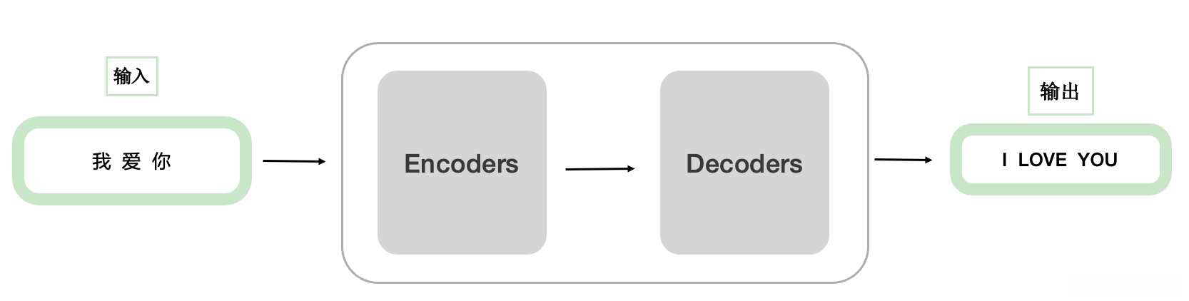 - \text S 输入后得到 \text I;接着进行 teacher forcing操作(teacher for thing),将 \text I 作为下一个时刻的输入信号;经过多次迭代后,在解码器中通过与编码器通信生成 \text {LOVE};依次类推……这是一个机器翻译的过程。