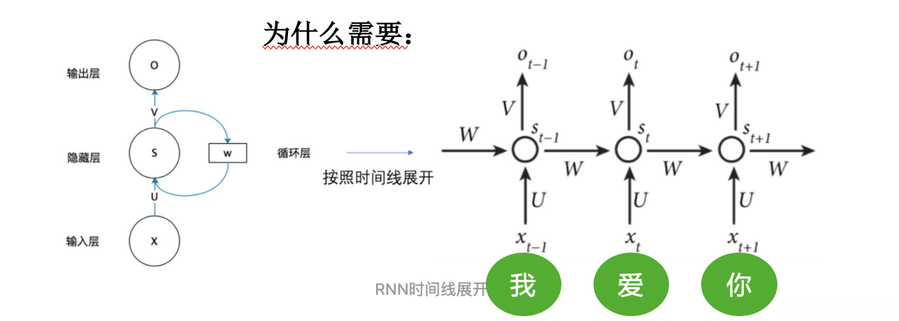从RNN的角度探讨为何需要位置编码时,默认已经是大家已知的事实:RNN通过共享一组固定的参数(包括输入参数W、隐层参数V、输出参数等)来处理不同时间步的信息传递过程。这种机制下,在展开的时间序列结构中(例如输入为"我爱你"),RNN能够按照自然语言处理的习惯依次处理每个词(先处理"我"再处理"爱")。