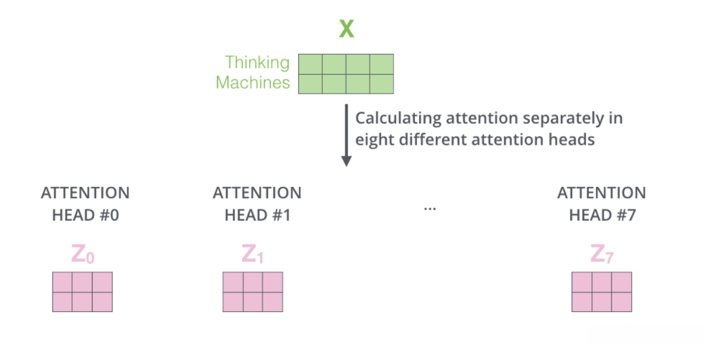 - 多头注意力机制: 即 h 个自注意力的集成方式(如上图中2个,在图中8个),本研究采用 h=8 进行说明。