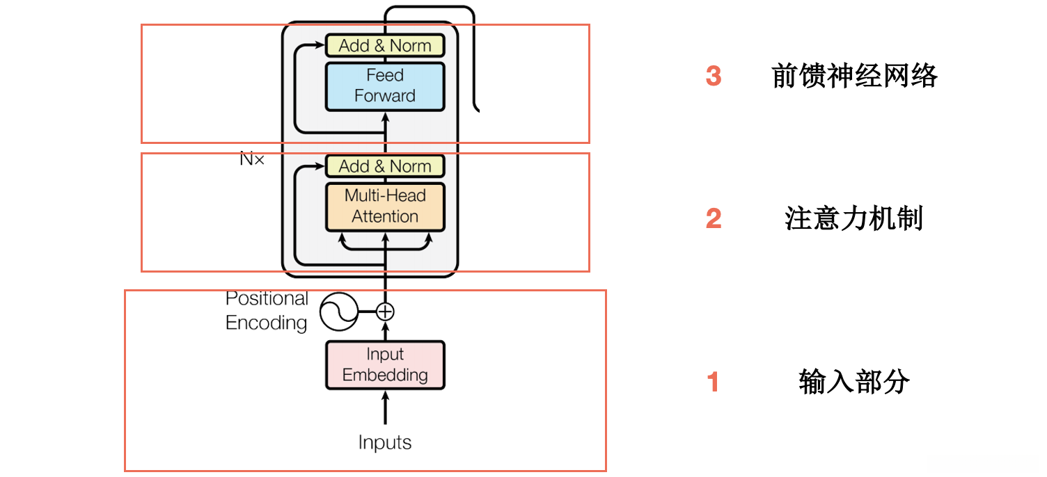 - 输入处理:嵌入层和位置编码层。