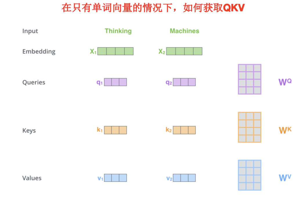 在实际操作中运用矩阵运算确实带来了极大的便利性与效率性!值得注意的是,在实际操作中我们将其称为"多头"机制,在本案例中仅采用了单一参数组\boldsymbol W^Q、\boldsymbol W^K、\boldsymbol W^V来进行运算。这种"多头"机制的本质是运用了多个独立的参数组分别提取查询(Query)、键(Key)与值(Value)信息。如图所示2所示,在这种情况下我们实际上只建立了一个完整的注意力计算过程而不像其他情况那样会有多组独立的参数参与运算。