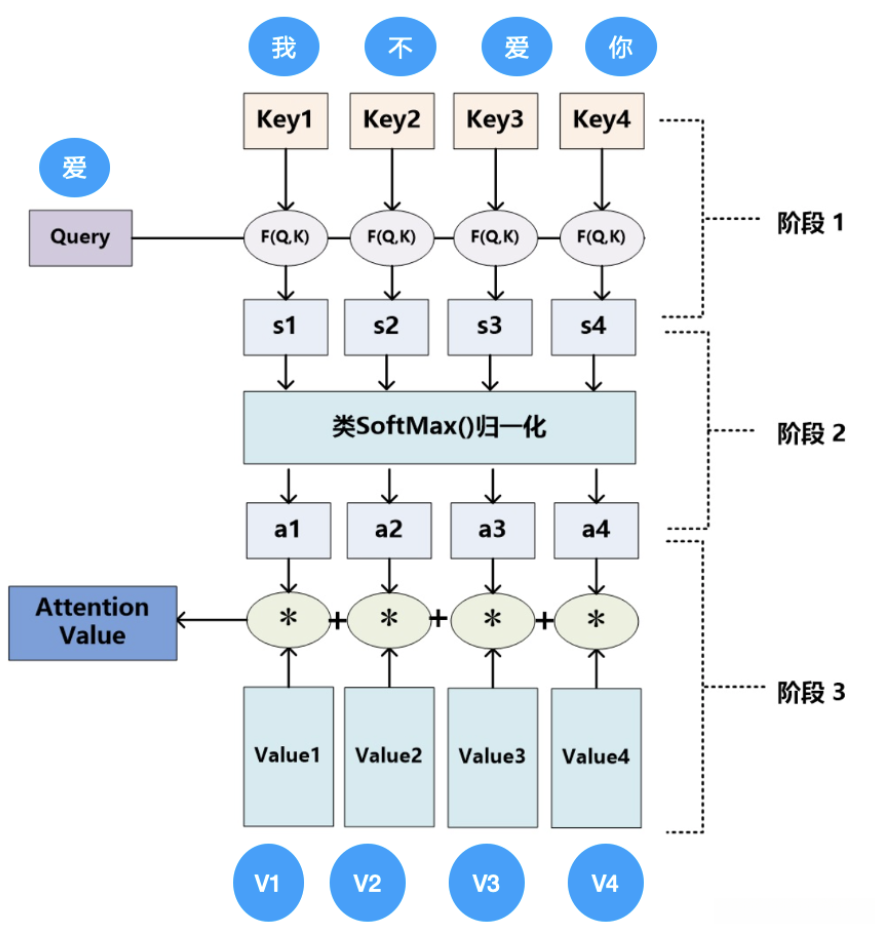 计算以下四个key向量:爱我、不爱、爱你;接着应用Softmax函数对结果进行归一化处理;最后将各部分按照权重相乘后再相加得到最终的attention value;其中权重a1到a4分别为0.7、0.1、0.1、0.1等值,并且它们的总和等于1。