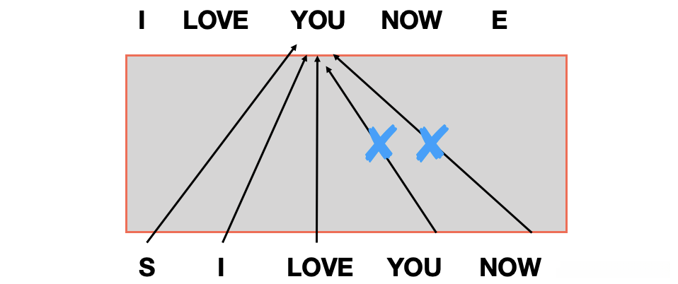 因此,在训练阶段我们需要对 "you" 和 "now" 这两个单词的信息进行遮蔽处理(masking),从而确保训练过程与解码器预测阶段的信息流动保持一致。这样一来,在生成阶段中就不会泄露未来的 ground truth 信息给模型参考。