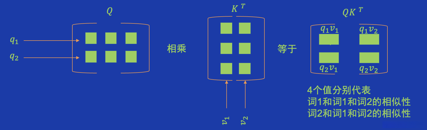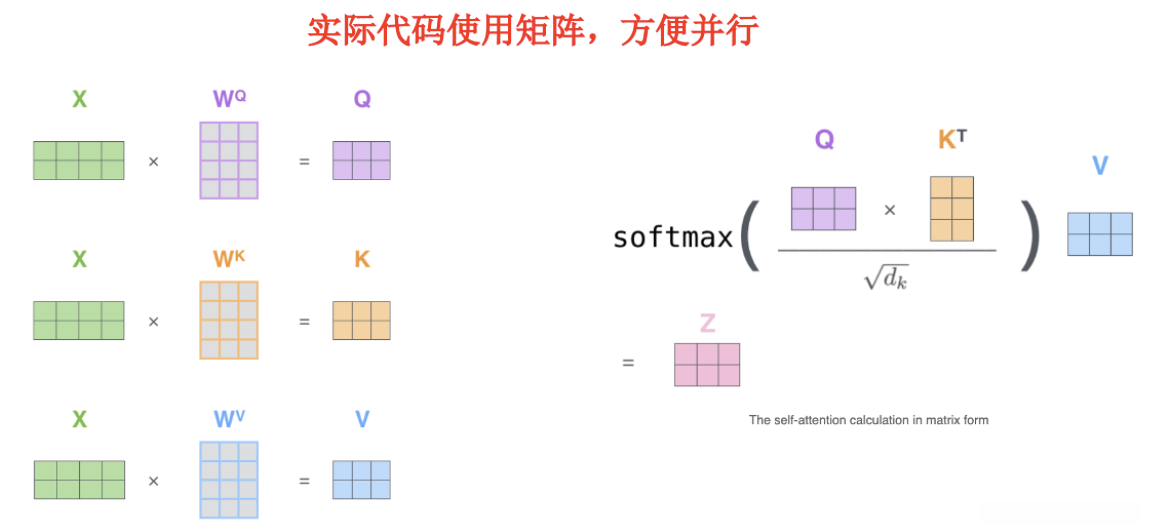 其中 \mathbf Q、\mathbf K 和 \mathbf V 分别代表查询(Query)、键(Key)和值(Value)矩阵,在计算过程中: