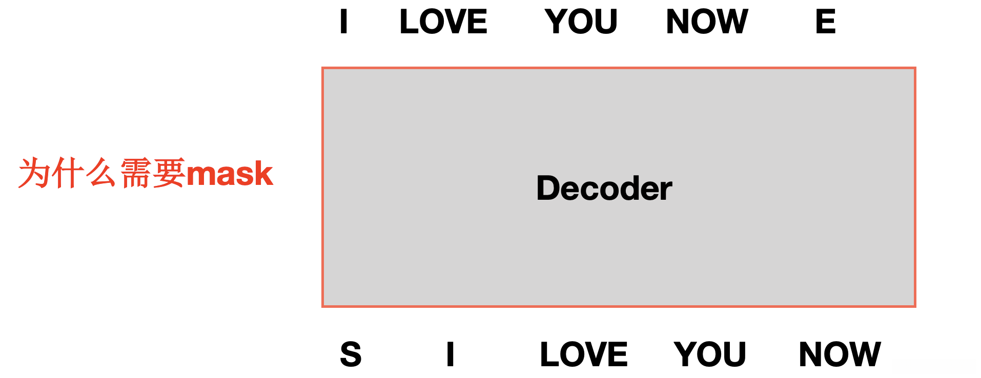 为什么需要mask?在训练过程中(training stage),当解码器开始预测 "YOU" 的时候(decoding stage),仍然可以看到后续生成词的信息(ground truth)"I love you now" 这些词会对模型的学习产生帮助作用。但在预测阶段(inference stage),即生成阶段时,在解码器中不会知道未来的真实输出信息(output sequence)。如果不对 "you" 和 "now" 进行遮蔽处理(masking),模型在训练过程中会看到这些后续单词的信息;但在实际预测过程中却无法访问这些信息。