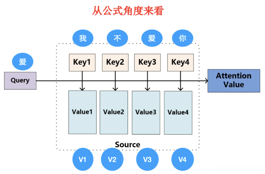 - NLP中的例子: 在此输入中,“Query”为"爱",“我不爱你”则包含四个键值对:key1到key4及其对应的值域分别为Value1至Value4。
