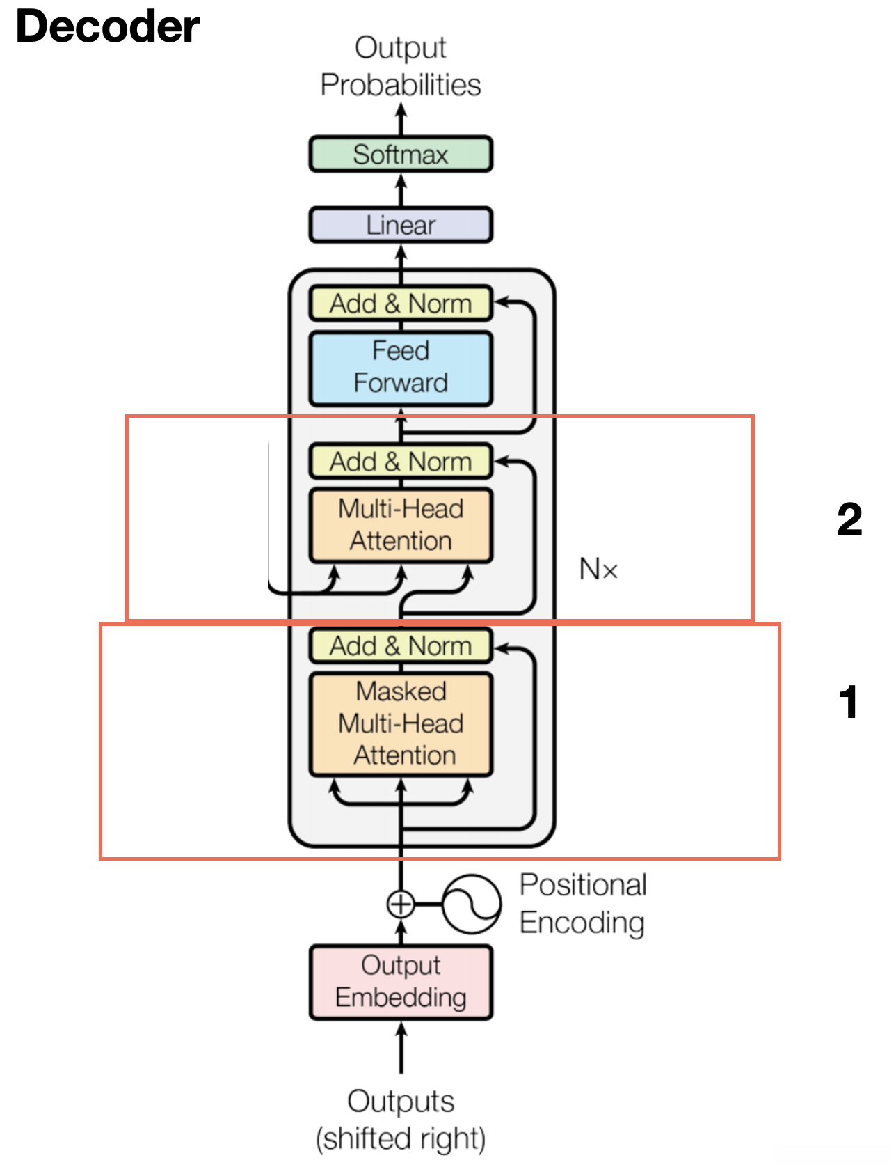 - 下面是Decoder部分,重点讲解一下1(掩盖多头注意力机制)和2(交互层,比encoder多了1层)两部分。