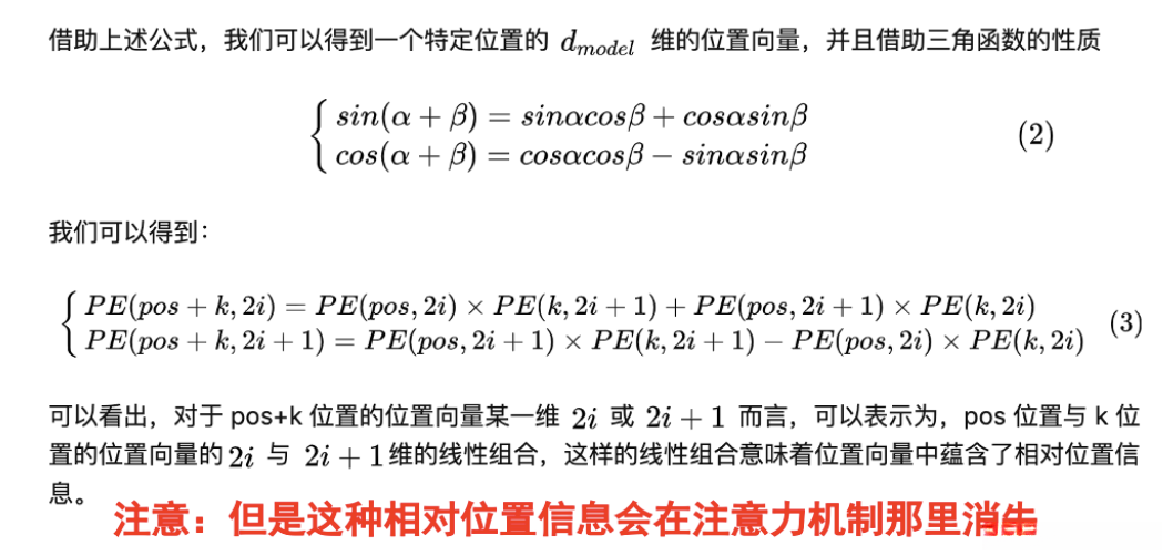 - 我想进一步解释为什么位置嵌入会有用 ,通过三角函数的应用我们可以从公式2推导出公式3。观察到公式3中使用第1行作为基准进行计算,在当前情境中pos表示我的位置坐标(例如,在本例中pos表示你的坐标),而k则表示爱的关系(例如,在"我爱你"这句话中k代表爱)。这种线性组合表明位置向量编码中包含了各元素之间的相对关系。需要注意的是,在注意力机制处理过程中这类相对关系会被后续模型处理机制所消除
